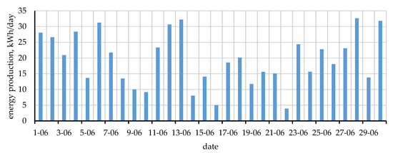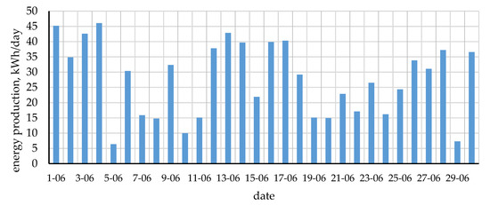 In 2018–2019, an analysis of the demand for electricity was carried out for the building (the annual total is about 5600 kWh), detailed results are included in the work by Kryzia et al. [43]. The energy produced in the installation replaces energy from the electricity grid at a price of EUR 0.14/kWh, the surplus energy produced is “virtually stored in the grid” (energy sent to the grid) and can be downloaded by the user again (up to one year) with a reduction of 20% (for installation power up to 10 kWp) [47].