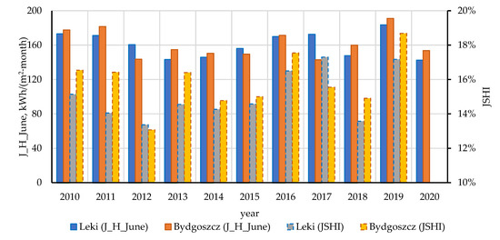 Based on the insolation data from 2010–2020 [33], the representativeness of insolation data for the analysed June 2020 (JSHI) was determined: