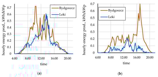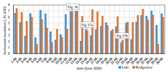 Based on the measured monthly data on energy production from both installations and statistical data on insolation on a horizontal surface and for angles characteristic for the installations under consideration (Figure 8 and Figure 9), the correction factors for multi-year analysis were determined. The method used in calculation had been based on [31,51,52,53]. In terms of that the following correction factors were determined: insolation coefficient (IJC), changes in insolation for a given direction and angle of panel installation (IDA), solar radiation conversion for the whole year (JSHIA). The following formula for annual energy gains (EAG) has been proposed: