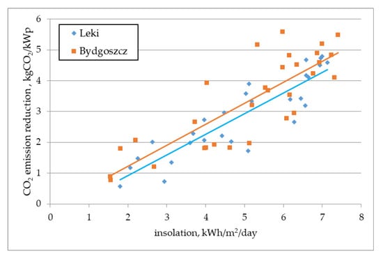 Additionally, the indicator unit (investment) cost of CO2 emission reduction factor (UCPVCO2) was calculated. The analysis was related to the 20 years of use of the investment and included the total installation costs (I0): Leki-EUR 4250, Bydgoszcz-EUR 9800.