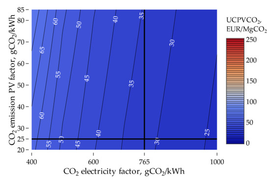 - UCPVCO2—Unit (investment) cost of CO2 emission reduction factor, EUR/kgCO2