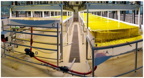 The pilot-scale 50 m2 TLC bioreactor consisted of two 12 m × 2 m channels made of white woven coated polyethylene pond liner (areal weight 320 g m−2, Daedler, Trittau, Germany). As with the 8 m2 TLC reactor, both channels were inclined 1° in opposite directions; however, they were installed at the same height and connected on both sides via an open retention tank, centrifugal pump, and inlet module, instead of using a flow reversal module on one side. This change allows for better scaling of the reaction system, since multiple channels can be connected in parallel on inclined ground-level ramps; however, at the cost of additional pumping stations. Target flow rate of both centrifugal pumps was set to 4.8 L s−1 in order to maintain identical hydrodynamic conditions (2.4 L s−1 m−1 in relation to channel width) in the 8 m2 and 50 m2 photobioreactors, respectively. The same CO2 gassing hoses and level sensors as used before were installed in both retention tanks, while pH measurement and automatic addition of tap water were exclusive to one tank. Since the actual reactor volume depends on the fluid level in both retention tanks, tap water addition occurred only when both level sensors registered a reduced volume simultaneously for at least 12 s. The level sensors additionally served to modulate the volume flow of each respective pump in an interval of ±0.15 L s−1 to level out both tanks and ensure uniform distribution of the microalgal suspension in the entire photobioreactor. The main characteristics of both TLC reactor designs are summarized in Table 1. A photograph of the 50 m2 TLC photobioreactor is shown in Figure 1.