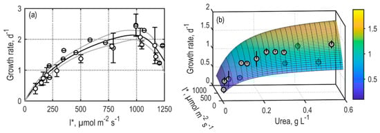 (a) Mean daily specific growth rates (○) as a function of integral photosynthetic photon flux density I* measured during 4 independent nutrient-replete batch processes of 10 days in a thin-layer cascade reactor (A = 8 m2) with M. salina under a physically simulated Mediterranean summer climate. Error bars represent 95% confident intervals. Equation (18) was fitted to experimental growth rates via nonlinear regression (―). The grey lines (―) represent the 95% confidence interval of the identified Equation (18). (b) Mean daily specific growth rates (○) of M. salina as a function of urea concentration and integral photosynthetic photon flux density I* in a continuously operated thin-layer cascade reactor (A = 8 m2, D = 0.3 d−1) with an influent urea concentration of 1.2 g L−1 under a physically simulated Mediterranean summer climate.