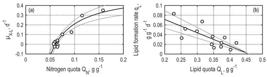 The same process data were used to estimate the maximum biomass specific lipid formation rate . Under nitrogen-depleted conditions, Equation (11) can be simplified so that can be estimated via nonlinear regression of Equation (21) to lipid formation data as a function of the lipid quota (Figure 3b).