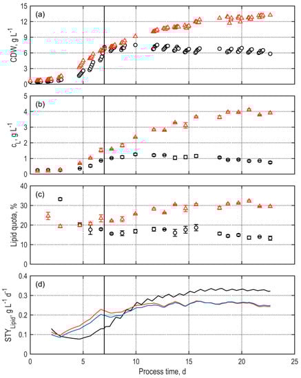 The decline of CDW concentration due to respiration in the dark was estimated as a mean biomass specific rate from 8 p.m. to 6 a.m. via online optical density measurements during the night in a continuous nutrient-replete cultivation without induction of lipid accumulation at a dilution rate of 0.3 d−1 (Figure S2). During 14 consecutive nights, the reduction in CDW concentration amounted to 6.7 ± 2.3% per night, resulting in a maximum biomass decay rate of 0.17 d−1. Nightly biomass loss might partially have been a consequence of the high shear stress caused by the centrifugal pump [44,45]. However, our result is in good accordance to the average rate of nightly biomass decay of 0.17 ± 0.037 d−1 (6.8 ± 1.4% w/w) measured in three different microalgae species, including M. salina, by Edmundson and Huesemann [38] in aerated shake flasks, as well as to the rate of Athrospira platensis cultures grown in tubular outdoor reactors with an overnight loss of 5–7.6% (w/w) [46].