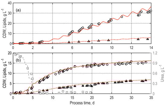 Batch processes with M. salina in a thin-layer cascade reactor under a physically simulated Mediterranean summer climate, applying (a) nutrient-replete and (b) nitrogen-limited growth conditions. Experimentally measured cell dry weight (CDW, error bars omitted for visual clarity, average relative standard deviation 0.7%) concentration (○), lipid concentration (△), and urea concentration (□), and simulated CDW concentration (─), lipid concentration (--), and urea concentration (--).