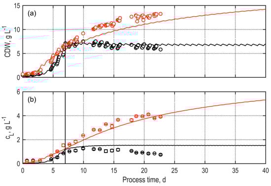 To validate the identified growth and lipid production model of M. salina in continuous operation, a cascade of two serially connected TLC photobioreactors (8 m2 and 50 m2, Section 3.1) was simulated. In this case, the predicted concentrations in the first TLC reactor were used as influent concentrations for the second reactor. In accordance with the experiment, simulation of the continuous operation was initiated on day 7 with a dilution rate of 0.4 d−1 in the first reactor and 0.05 d−1 in the second reactor. At the end of the batch phase, experimental CDW concentrations measured in the first TLC reactor of 7.1 ± 0.02 g L−1 were identical within the estimation error compared to the simulation (Figure 6a). In the second TLC reactor, a CDW concentration of 6.9 ± 0.02 g L−1 was measured, whereas the simulation predicted 5.9 g L−1. During continuous operation, the CDW concentration in the first reactor stabilized at a steady-state concentration of 6.5 ± 0.32 g L−1, which was overestimated by 4.6% in the simulation at 6.8 ± 0.10 g L−1. However, the simulation predicted a slightly smaller deviation of 0.3 g L−1 between the lowest CDW concentrations in the morning and highest in the evening compared to a difference of about 0.7 g L−1 measured experimentally. Due to a further increase in CDW concentration in nitrogen-limited conditions, the second reactor reached a maximum CDW concentration of 13.3 ± 0.12 g L−1 at the end of the process after 23 days. The simulation underestimated the final CDW concentration by 11.7% at 11.7 g L−1. Due to the high mean hydraulic residence time of 20 days in the second reactor, a steady state was not reached during the process time. In order to reach a steady state in the second reactor, at least 3–5 mean hydraulic residence times would be necessary after achieving a steady state in the first reactor. The respective simulation of a 100-day process predicted a steady-state CDW concentration of 17.0 g L−1.