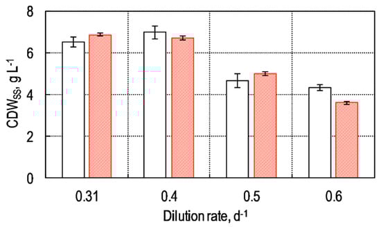 Additionally, experimental results and simulations of single-stage continuous processes with four different dilution rates at different feed concentrations in the inlet flow were compared in terms of steady state CDW concentrations after at least three mean hydraulic residence times of continuous operation (Figure 7). The dilution rates studied were 0.31 d−1, 0.4 d−1, 0.5 d−1, and 0.6 d−1, respectively with feed medium according to urea concentrations of 1.2 g L−1, 1.5 g L−1, 1.2 g L−1 and 0.9 g L−1, respectively. Steady-state CDW concentrations declined at higher dilution rates of 0.5 d−1 and 0.6 d−1 in both experiments and simulations. This was expected, since the microalgal growth rate mainly depends on the availability of light in the culture suspension, which increases with decreasing CDW. The average deviation between simulation and experiment was 8.3 ± 5.0%, which further confirms the applicability of CDW simulations in continuous processes.