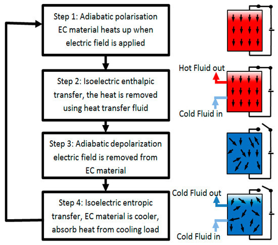 - Ožbolt, M.; Kitanovski, A.; Tušek, J.; Poredoš, A. Electrocaloric vs. magnetocaloric energy conversion. Int. J. Refrig. 2014, 37, 16–27. [Google Scholar] [CrossRef]