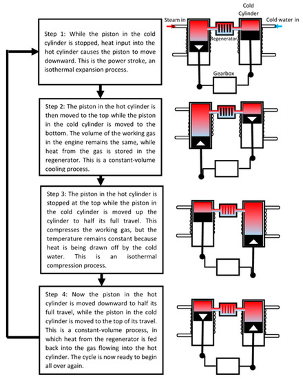 - Transfer: The same transfer operation is repeated to transfer the air to the hot cylinder and thus complete the cycle.