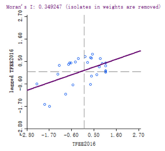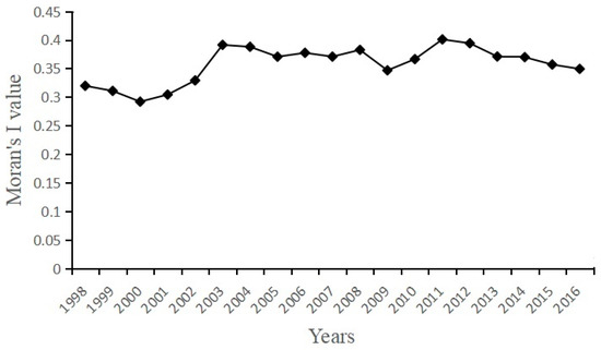 It can be seen from Table 1 and Figure 1, the values of are positive and fluctuate around 0.366 from 1998 to 2016, with little change year-on-year, which implies a positive correlation. On the whole, the energy efficiency has a slight upward trend, and the spatial autocorrelation of energy efficiency is gradually increasing although the future trend is unclear.