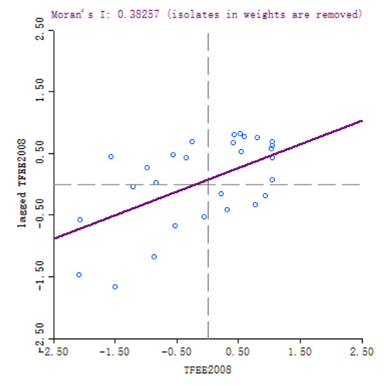 Figure 1, Figure 2, Figure 3, Figure 4 and Figure 5 show that regions located in the first quadrant (High-High) are mainly the provinces and cities with higher economic development in the eastern coastal areas, such as Guangdong, Fujian, Zhejiang and Shanghai etc. The economic development of these provinces and cities is rapid. They have a positive influence on each other’s development. Provinces and cities in the third quadrant (Low–Low) are mainly distributed in northwest China such as Qinghai, Ningxia, Xinjiang, Gansu etc., where economic development is relatively backward with lower energy efficiency. The energy efficiency value of surrounding provinces and cities is also relatively low. Most provinces and cities in central China are located in the second quadrant (Low–High). In the fourth quadrant (High–Low) the energy efficiency values of various provinces and cities are interleaved, with little dependence on each other. Briefly, China’s provincial energy efficiency has obvious spatial autocorrelation. The energy efficiency value of a province is largely affected by the energy efficiency values of its neighboring provinces.