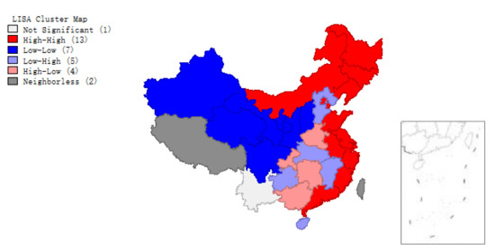 The scatter plots of (Figure 2 and Figure 3) and clustering graphs (Figure 4 and Figure 5) of LISA indicate that the spatial agglomeration of energy efficiency in China’s provinces tends to be stable. We can see that the energy efficiency of Chinese provinces is not randomly distributed. The energy efficiencies of regions with similar properties tend to gather together (High value of energy efficiency is adjacent to the high value of energy efficiency, low value of energy efficiency is adjacent to a low value of energy efficiency). The map is divided into four quadrants: The first quadrant (High-High) represents a space unit with a high energy efficiency value. Its neighboring provinces and cities are also high-efficiency units; The second quadrant (Low–High) represents the region with a low energy efficiency value. The energy efficiency values of its neighboring regions are at high level; the third quadrant (Low–Low) represents a low-energy efficiency space unit, and its neighboring provinces and cities are also low-efficiency units; The fourth quadrant (High–Low) represents a region with high energy efficiency value, but its neighboring region efficiency value is low.