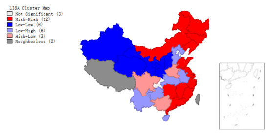 In [19], Lu and Zhang calculated energy efficiency according to (2) based on the low-carbon GDP output, where , and . Based on the results in [19], here we obtain yearly and LISA during the study period 1998–2016. The spatial weight matrix is designed following the rook adjacency rule. Hainan province’s geographical location in China is special, an island across the sea from the mainland. There will be no neighbors under the rook adjacency method. However, since the reform and opening up, Hainan province has become increasingly close to the outside world. So we consider Hainan province to be adjacent to Guangdong province.