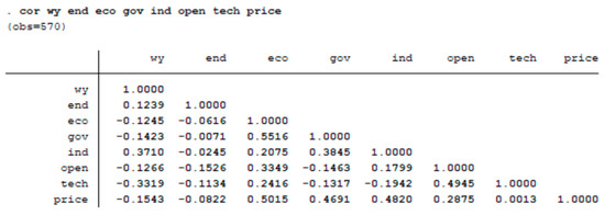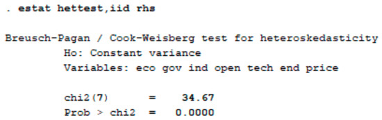 Base on results above, there are obvious spatial autocorrelation and spatial clustering phenomena in China’s provincial energy efficiency. The energy efficiency value of each province and city is affected by the neighboring regions’, which makes it reasonable to describe the data by a spatial autoregressive model. We take resource endowment (End), level of economic development (Eco), degree of government intervention (Gov), industrial structure (Ind), degree of opening to the outside world (Open), technical level (Tech) and energy prices (Price) as the main factors that affect energy efficiency. We use the spatial quantile autoregressive model (14) to analyze the influence of seven factors on energy efficiency values at the quantiles of . Before build models, at first we preprocess the data set. For linear regression analysis, hypothesis testing on the data is necessary. Here we need to consider the multicollinearity of all explanatory variables. We also consider the heteroscedasticity of data. From Figure 6, we found that all explanatory variables have no multicollinaerity. The hypothesis test result in Figure 7 shows that the data are of heteroscedasticity, which implies that ordinary linear regression is invalid while quantile regression is a better tool to deal with the data with heteroscedasticity.
