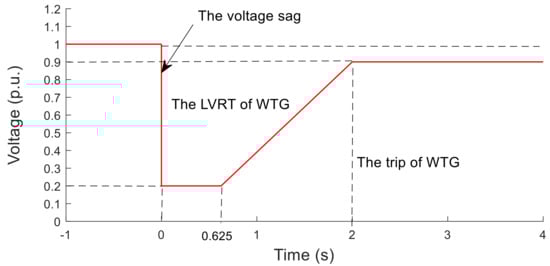 According to the grid codes of China [26], the PMSG-based WTG should have sufficient LVRT capabilities. Here, the LVRT requirements of China are shown in Figure 1. It is stated that the PMSG-based WTG should keep connected to the power system for the grid voltage above the curve and the trip of PMSG-based WTG occurs otherwise. In the worst case, the voltage sagged to 0.2 p.u. and lasted for 0.625 s at most, and the voltage should recover to 0.9 p.u. within 2 s.