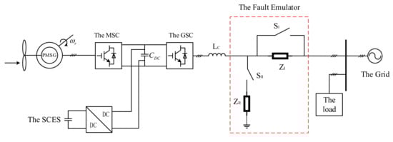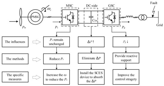 In addition, the studies on auxiliary device modification are also attention-attracting for its characteristics of a fast response and wide adjustable range under different levels of voltage sags. In [21,22], the excess energy of DC side was dissipated by the chopper circuit to avoid the overvoltage of the DC side and eliminate the mismatch between the input power of MSC and the output power of GSC. The method is utilized widely for its simple control strategy and low costs. However, it is noteworthy that the efficiency of PMSG is declining owing to the waste of energy, and the overheating problem occurs under severe faults. In [23], as a multiple-functional flexible alternating current transmission system (FACTS) device, the electronic power transformer (EPT) was combined with energy storage system to enhance the LVRT capability of PMSG. In [24], the supercapacitor energy storage (SCES) devices were installed on the DC-side, and they can absorb the surplus active power of DC-side to prevent the DC link capacitor from overvoltage. The effectiveness of the SCES is verified comparing with conventional current-limiting strategy. However, there was no specific capacity configuration scheme of the SCES in [24]. The superconducting magnetic energy storage (SMES) was presented in [25] to improve the LVRT capability and transient stability of PMSG, the superconducting fault current limiter (SFCL) was utilized to increase the output power of GSC, while the excess power was absorbed by the SMES so as to reduce its energy storage capacity.