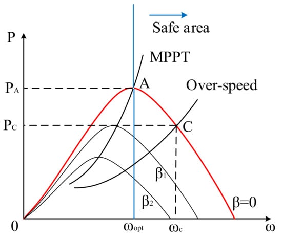 Thus, to eliminate the mismatch between the input power of MSC Ps and the output power of GSC Pg, the input power Ps needs to be reduced by ΔP. Then the deloading rate is defined as d = ΔP/PA, where PA is the maximum power captured by the wind turbine in the MPPT mode. Due to the static instability problem caused by under-speed control [28], then overspeed control is generally adopted to keep the rotor working in the safe area (i.e., the right area of the optimal speed ωopt) [29]. The power of the overspeed point PC can be represented as: