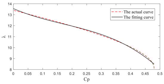Under the condition of β = 0, Cp is given according to Equation (8), and then λ can be obtained by Equations (3) and (4). Furthermore, the rotor speed reference ωref can be calculated easily according to Equation (5). However, consider the strong nonlinearity of the Cp-λ curve, it is hard to find the concrete expression of inverse function of Cp = f(λ). To address this issue, in this paper, the least square method is was to fit the inverse function of Cp = f(λ).