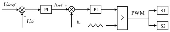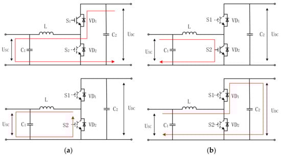 Thus, the control strategy of the bidirectional DC–DC converter is displayed in Figure 6. The voltage control outer loop achieves the voltage stability by tracking DC voltage, while the current control inner loop improves the response speed. Furthermore, the working mode of the bidirectional DC–DC converter is shown in the Figure 7, when the S1 is triggered, the converter works in the buck mode and the SCES absorbs the energy from the DC-side; when the S2 is triggered, the converter works in the boost mode and the SCES transfers the stored energy to the DC link. It should be noted that S1 and S2 cannot be triggered concurrently.