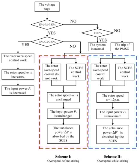 The control strategy of Scheme Ⅰ is as follows: When the voltage sag depth k ≤ 30%, the rotor overspeed control is adopted. Contrarily, the SCES control is adopted. The specific control flow chart is shown in Figure 8.