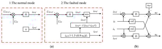 where ug is the grid voltage and IN is the rated current. According to Equation (20), instead of the unity power factor control, the GSC is utilized to provide reactive power support, in other words, the GSC is set to the Q-priority mode [34]. Accordingly, the active current should be limited by Equation (21) during faults because of the current limit of GSC, and the active current reference adopts the smaller one between idref1 and idref2. The reference control variables of the GSC are altered so as to provide reactive support to the grid under faults. The control strategy of GSC is shown in Figure 9.