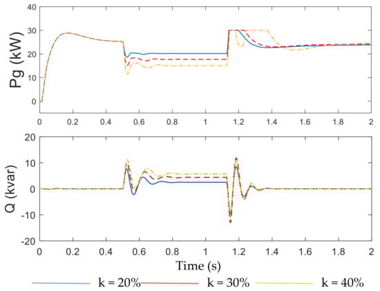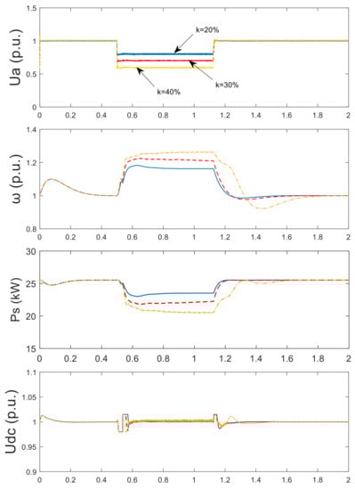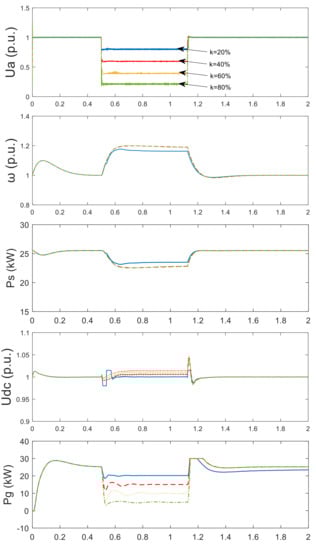 The response characteristics of PMSG-connected system with the rotor overspeed control scheme under faults are shown in Figure 11. According to the voltage sag depth, the rotor speed ω is regulated to reduce the input power of MSC, so that it can maintain the power balance of the system and keep the DC voltage fluctuated in the range within permission. The GSC can provide the reactive power to the grid under the voltage sags. When the voltage sag depth k > 30%, the rotor speed has exceeded the upper limit of wind turbine, which is not allowable in practice.