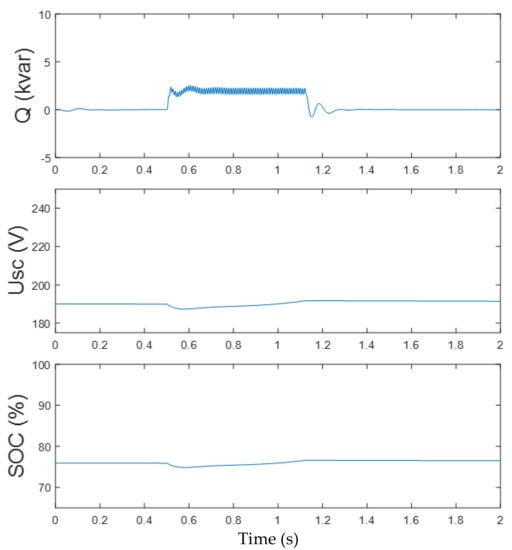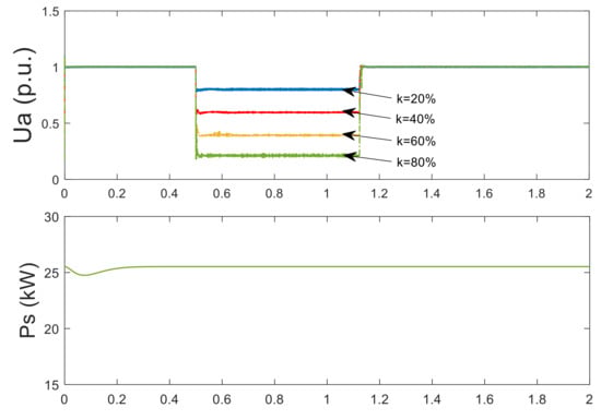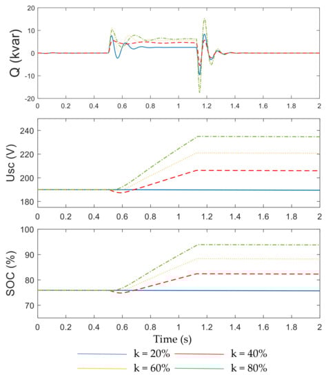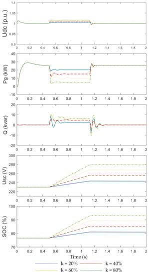 The response characteristics of PMSG-connected system with the SCES control scheme under faults are presented in Figure 12. The input power of the MSC remained unaltered under any voltage sags because there no measures were adopted in the machine side. The unbalance power of the DC-side leads to the fluctuation of DC voltage. The SCES was utilized to absorb the unbalanced power on the DC side and stabilized the DC voltage. The GSC was used to provide the reactive power to enhance the LVRT capacity. When the worst fault occurred (i.e., the voltage sag depth k was 80%), the voltage of the SCES Usc increased from 230 to 279 V, SOC increased from 76% to 93%, the two values of the SCES were both in the allowable limit. The SCES control scheme could enhance the LVRT capacity of the PMSG under the all levels of faults.