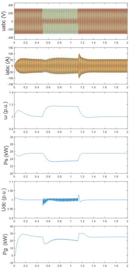 In Figure 14, it can be observed that, when the voltage of A-phase sagged to 20% (i.e., the maximum degree of voltage sags), the rotor speed was increased but did not reach to the upper limit, that is the unbalanced power can be eliminated only by regulating the rotor speed, and then the SCES was inoperative. In addition, the reactive power generated by the GSC contained 2 ω oscillations due to the negative component of the grid, and the voltage of DC-side also consisted of 2 ω oscillations. However, the oscillation of DC voltage was within the allowable range. Apparently, the overspeed-while-storing control fulfilled the LVRT of PMSG and prevented the DC capacitor from overvoltage under single line-to-ground fault.