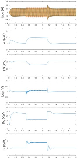 Another simulation of the overspeed-while-storing under the double line-to-ground is shown in Figure 15, when the voltage of B-phase and C-phase sagged to 20%, the rotor was increased to the maximum value (i.e., 1.2 p.u.) and the surplus power of DC-side was absorbed by the SCES. The values of SCES were in the allowable range due to the capacity being configured under the most severe fault (i.e., symmetrical fault). It can be seen that the DC voltage and reactive power suffered 2 ω oscillation during faults, as a result of the negative component of the unbalanced voltage. However, this 2 ω oscillation was small enough not to affect the stability of the system. Thus, the overspeed-while-storing control fulfilled the LVRT of PMSG and prevented the DC capacitor from overvoltage under the double line-to-ground fault.