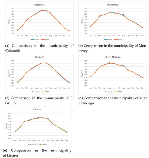 Five geographic points were selected to cover a sufficiently representative area of the state of Nuevo León, where Colombia is at the north of the state, Linares at the center, El Grullo at the east, Monterrey at the west and Mier y Noriega at the south. Then, the average total solar irradiation per month was calculated from these specific geographic points and compared against the data from the NASA SSE database. Table 1 present the locations and geographic coordinates.