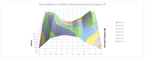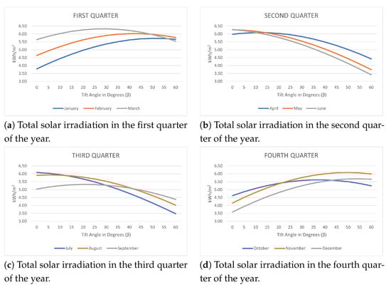 Figure 3 illustrates the relationship between the month of the year, the tilt angle () and the solar irradiation. The aim of this figure is to provide a guide that presents how solar irradiation behaves respect to different tilt angles during the year. Additionally, Figure 3 offers an easy way to analyze data, which can be used to accelerate decision making regarding the orientation of solar harvesting systems for optimal performance or planning minimum values of solar irradiation throughout the year.