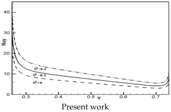 Next, left local Nusselt evolution versus vertical wall for different volume fraction () in case 1 and at Ra = 105 is represented in Figure 8. As shown in this plot, it is found that the volume fraction is a parameter that can potentially increase thermal behavior inside the cavity.