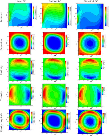 A quantitative study is presented in Figure 10, where steady state dynamic and thermal profiles behavior for the three cases of the partially thermalized left boundary conditions at volume fraction and Ra = 105 are highlighted. We notice that isotherms, streamlines, horizontal velocities, vertical velocities, velocity magnitudes, and pressures present the maximum values for the case of the sinusoidal central partially heated left boundary and the minimum values for the linear ones, which is in good concordance with previous results in Figure 9.
