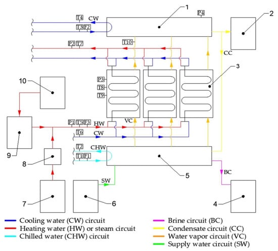 Simplified diagram of the test stand. 1—condenser; 2—distillate tank; 3—adsorption bed; 4—brine tank; 5—evaporator; 6—degasification tank; 7—steam generator; 8—manifold; 9—hot water tank; 10—electric heater; T1—chilled water inlet temperature; T2—chilled water outlet temperature; T3—cooling water inlet (to the condenser) temperature; T4—cooling water outlet (from the condenser) temperature; T5—heating water/steam inlet temperature; T6—cooling water inlet (to the bed) temperature; T7—heating water/steam outlet temperature; T8—temperature inside the heat exchanger; T9—temperature of the free space of the bed; T10—temperature of water vapor leaving the bed and flowing to the condenser; F1—chilled water flow rate; F2—cooling water flow rate; F3—heating water/steam flow rate; P1—steam inlet pressure; P2—steam outlet pressure; P3—pressure inside the bed; P4—pressure inside the condenser.