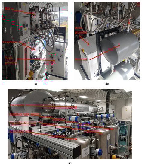 Pictures of the test stand: (a) front view on the beds, evaporator and steam generator; (b) front view on the steam generator and manifold; (c) back view on the condenser, distillate tank, degasification tank and brine tank.