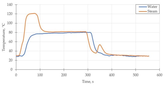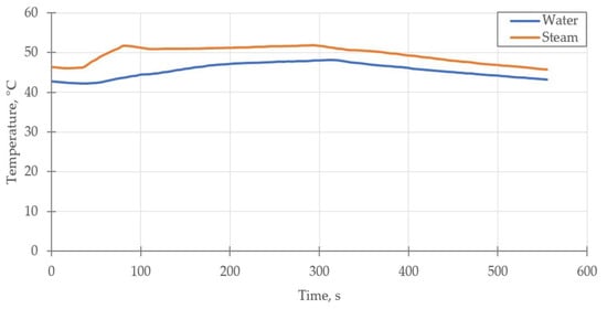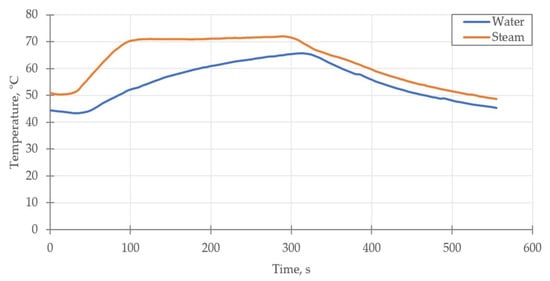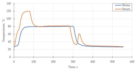The temperature of the free space of the bed is presented in Figure 7. It can be noticed that the temperature of the free space in the bed preheated with steam increases and stabilizes faster and is higher than in the case of preheating with water. With the use of steam, the temperature of the free space in the bed reaches a constant value of 50 °C already after 80 s from the beginning of the cycle. On the other hand, the temperature of the free space in the bed preheated with water increases gradually, reaching its maximum (about 48 °C) after 300 s.