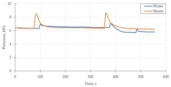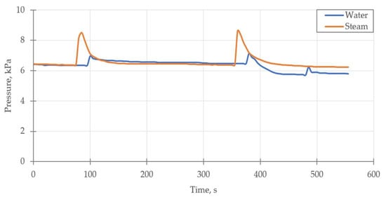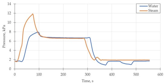 Such observations are confirmed by the pressure distribution in the condenser, which is shown in Figure 9. For bed preheating with steam, the pressure change in the condenser is more dynamic than in the case of water. Regarding steam preheating, after the initial pressure increase (facilitating the formation of condensate in the condenser), the pressure drops quite quickly, which leads to the flow of larger amounts of water vapor from the bed and, therefore, enhances the effectiveness of water desalination.