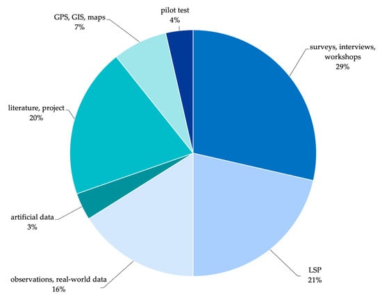 There are not many ways researchers can obtain data for the studies in the transportation area. The most common method is to conduct interviews and surveys; another more difficult procedure is gaining information from transport organizations (oftentimes, such data is protected by the confidentiality agreement and cannot be openly displayed). Furthermore, some perform field tests or observations or use GPS tracking data; others use knowledge from the literature or previously developed projects. The pie chart in Figure 1 shows the proportion of the data sources that have been used in the scientific papers cited in this article.