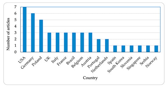 Deliveries of freights by bicycles are performed in many urban areas around the world, although a study of the scientific literature of recent years has shown that most research on CB activities was conducted in the USA in such cities as Seattle, Austin, New York, Portland, and others. Germany comes second with six heavily researched cities. Slightly fewer articles were detected in Poland. The further ranking is shown in Figure 2.