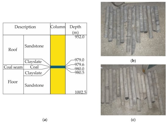 Place of sampling: (a) lithological profile of the immediate vicinity of the hard coal seam; (b) claystone cores; (c) sandstone cores.