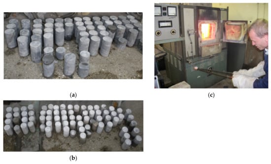 Preparation for tests: (a) regular samples of claystone; (b) regular samples of sandstone; (c) heating in a laboratory furnace.