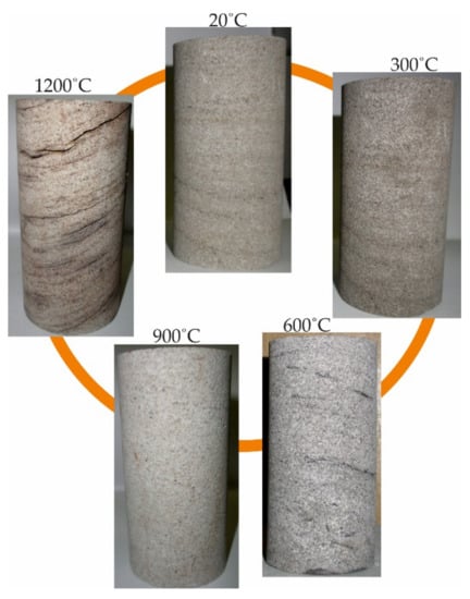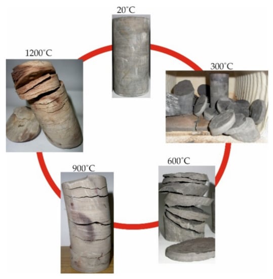Strength tests regarding sandstone and claystone heated at 300 °C, 600 °C, 900 °C and 1200 °C were carried out in a hydraulic press at the laboratory of the Faculty of Civil Engineering and Resource Management at the University of Science and Technology in Krakow. The load measurement was carried out using three strain gauge force sensors, while to determine the vertical deformation, a line encoder with a sampling frequency of 100 Hz was used. In order to determine the horizontal deformations, three electronic sensors were used and spaced 120° apart on the circumference of the sample. The load rate was 0.1 kN/s. After heating, the samples were tested at room temperature, about 20 °C. The load and deformation sensors were connected to the measuring amplifier, which in turn was connected to a computer on which the load–displacement characteristics were monitored on an ongoing basis. Young’s modulus was determined at the value of 20–80% of the breaking stress. The density of the samples was determined using the hydrostatic method [28] with the use of a WPS 210/C/1 laboratory balance. Additionally, for the temperatures of 300 °C, 600 °C, 900 °C and 1200 °C, the weight loss was determined. The samples were weighed on a WPT 2 laboratory balance. As a result of the temperatures of 600 °C, 900 °C and 1200 °C, the claystone samples lost their cohesion and divided into irregular pieces. Moreover, several samples were also damaged at the temperature of 300 °C (Figure 3). On the other hand, sandstone samples heated at 300 °C, 600 °C, 900 °C kept their form. Only at the temperature of 1200 °C did numerous cracks appear (Figure 4). The results of the compressive strength, tensile strength, Young’s modulus, Poisson ratio, density and weight loss tests are shown in Figure 5, Figure 6, Figure 7, Figure 8, Figure 9 and Figure 10.