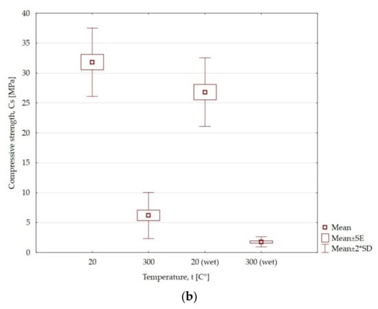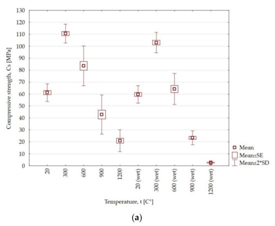 The average compressive strength of sandstone samples at 20 °C was 61.2 MPa. Increasing the temperature to 300 °C and 600 °C increased the strength by 80% and 36%, respectively. On the other hand, at the temperatures of 900 °C and 1200 °C, a significant decrease in strength was recorded, by 30% and 65.6%, respectively, in relation to the initial value. For the heated samples, which were then kept in water for 24 h, the range of changes compared to the temperature of 20 °C was an increase of 72% and 7.7% for the temperatures of 300 °C and 600 °C, respectively. The influence of temperature and water caused a drop in strength by 60.7% and 95.7%, respectively, for the temperatures of 900 °C and 1200 °C. The influence of water on the heated samples caused a decrease in compressive strength by 8%, 28.3%; 30.7% and 30.1%, respectively, for the temperatures of 300 °C, 600 °C, 900 °C and 1200 °C compared to samples that were only heated. In the case of claystone, the influence of the temperature of 300 °C caused a drop in strength by 80.5% and 93.3% for the heated and wet samples, respectively, compared to the initial value. This means that the influence of water contributes to a further decrease in strength by almost 13%.