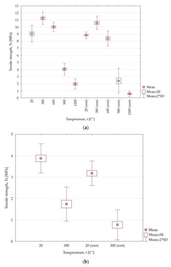 The influence of high temperatures on changes in tensile strength of dry and wet samples: (a) sandstone; (b) claystone; SE—standard error; SD—standard deviation.