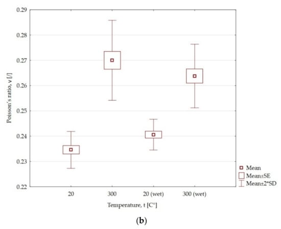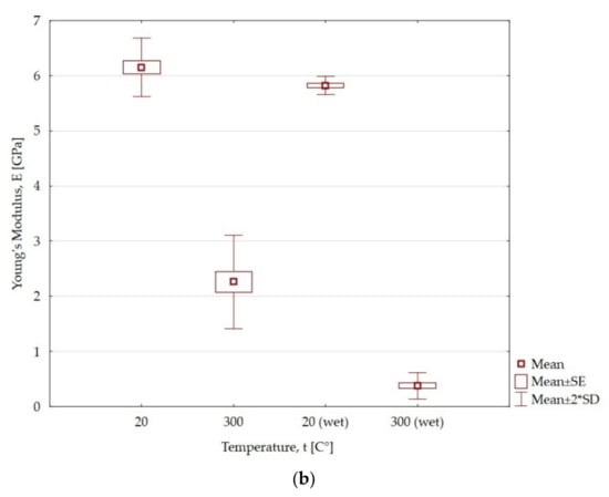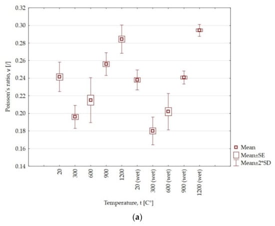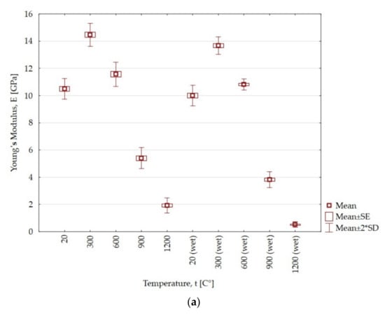At the temperature of 300 °C and 600 °C, the value of Young’s modulus increases by 3.96 GPa and 1.07 GPa, respectively, compared to the temperature of 20 °C. However, at temperatures of 900 °C and 1200 °C, the value drops and is lower by 5.1 GPa and 8.58 GPa, respectively, compared to the initial value. As a result of the action of water, the Young’s modulus decreases by 0.79, 0.75, 1.58 and 1.4 GPa, respectively, for samples only heated at the temperatures of 300 °C, 600 °C, 900 °C and 1200 °C. In the case of claystone heated at 300 °C and when wet, the Young’s modulus decreases by 3.89 GPa and 5.44 GPa, respectively. The action of water results in an almost six times lower value of Young’s modulus compared to samples only heated for the maximum temperature of claystone.