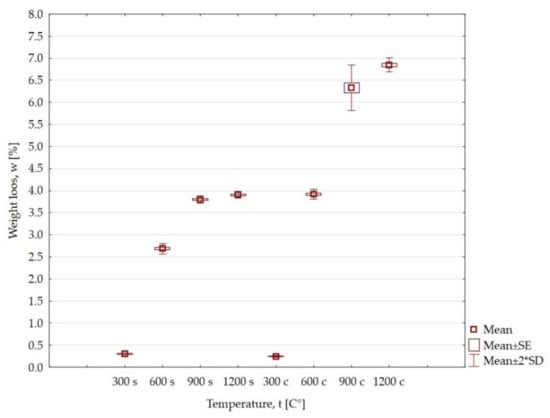 Heating sandstone and claystone at the temperature of 300 °C does not significantly affect the loss of weight. The losses are very small and amount to 0.3% and 0.24%. At the temperatures of 600 °C, 900 °C and 1200 °C, the losses are one order higher compared to the temperature of 300 °C. The loss of mass at these temperatures for claystone in relation to sandstone is greater by 1.24%, 2.53% and 2.94%, respectively.