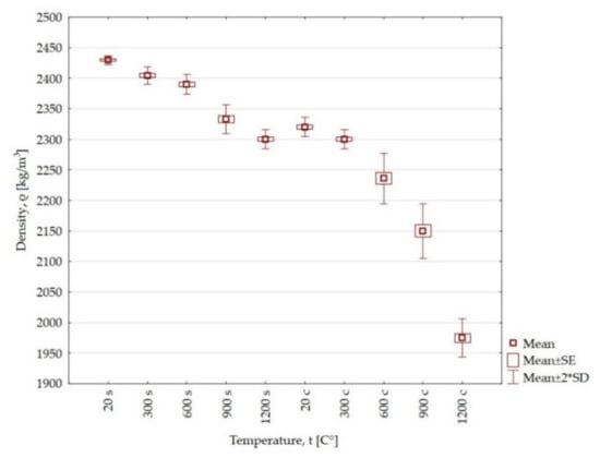 With increasing temperature, the density of both sandstone and claystone decreases. However, much greater changes occur for claystone samples. For both rocks heated at the temperature of 300 °C, the change in density is at a similar level and amounts to about 1%. On the other hand, at the temperatures of 600 °C, 900 °C and 1200 °C, there is a further reduction in density, with the changes being greater for claystone by 1.98%, 3.35% and 9.54% compared to the sandstone samples.