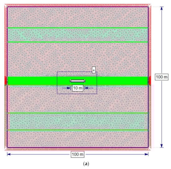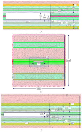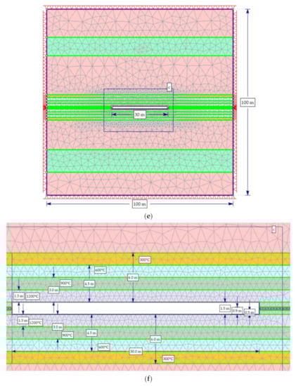 The main goal of numerical modeling was to determine the extent of the rock destruction zone around the gasification channel. For this purpose, RS2 [31] software was used, which is based on the finite element method. For the evaluation of the damage zones, the strength factor was selected, expressing the ratio of the rock strength to the reduced stresses at a given point. Strength factor values below 1 indicate material failure. The modeling adopted the Hoek–Brown criterion, which links the compressive strength and material constants determined using RocData software [31]. The results obtained from the laboratory tests were used in numerical simulations. A square target with a side length of 100 m was adopted in the modeling. In numerical modeling, it was assumed that the horizontal and vertical stresses are equal to each other: σ1 = σ3 = σz = 23.3 MPa. The adoption of such a value resulted from the depth of the hard coal deposit and the unit weight of the overburdened rocks. The size of the model was selected so that for the largest width of the gasification channel, equal to 30 m, the extent of rock destruction could be recorded. The models adopted a graded mesh and six-noded triangles with a gradation factor equal to 0.1. The number of nodes on all excavations was equal to 110. The models were restrained on all sides. As most of the claystone samples were destroyed under the influence of the temperature of 300 °C (Figure 3), the modeling assumed that the height of the gasification channel was 1.5 m. This height consisted of the thickness of the coal seam equal to 0.4 m and the total destruction of claystone rocks in the roof and the floor with a total thickness of 1.1 m (Figure 1). In the numerical simulations, three widths of the gasification channel, 10, 20 and 30 m (Figure 11a–c), were adopted. In addition, three ranges, 0.5, 1.0 and 1.5 m (Figure 11d–f), for the effects of high temperatures both in the roof and floor of the coal seam were modeled. The test results are shown in Figure 12, Figure 13, Figure 14, Figure 15, Figure 16 and Figure 17 and Table 2.
