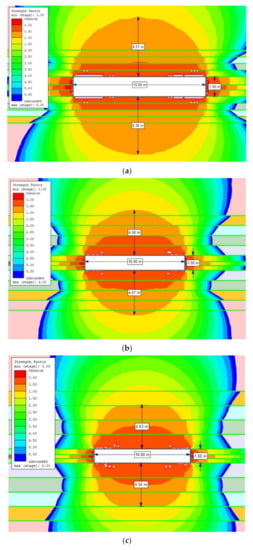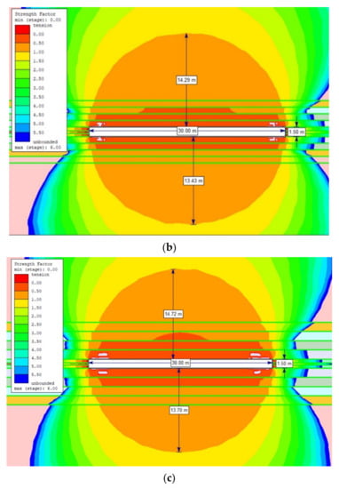 The extent of the rock destruction zone around the gasification channel with a width of 30 m and the impact of temperature of 1200 °C for the dry rock mass, up to the height of: (a) 0.5 m; (b) 1.0 m; (c) 1.5 m.